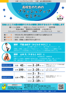 ブラッシュアップセミナー | 高等学校卒業予定の就職内定者向けセミナー。社会人としての基本姿勢やスキル等の習得に役立つ内容で実施しています。セミナーを通して、県内企業に就職予定の「地域同期」との交流にもつながります。 |