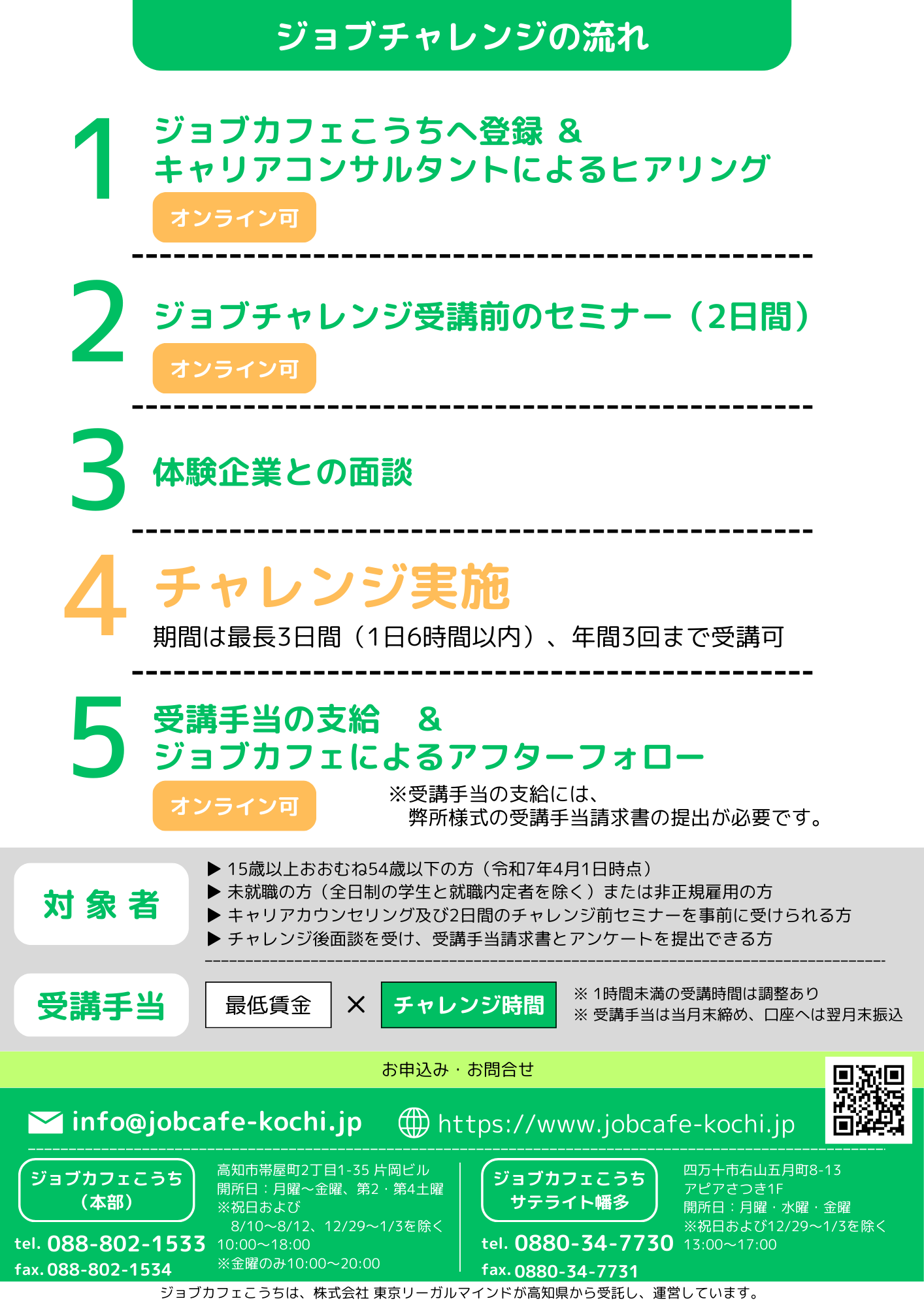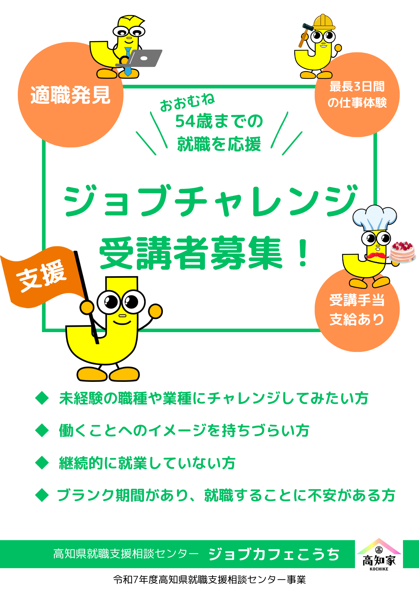 ジョブカフェこうちの「ジョブチャレンジ」は15歳~概ね54歳(R7.4.1時点)の方を対象とした支援制度です。