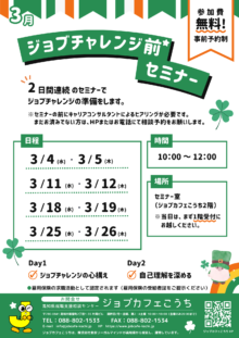 2日間連続のセミナーでジョブチャレンジの準備をします。15歳~概ね54歳の方(令和7年4月1日時点)が対象です。対象年齢外の方はご相談ください。