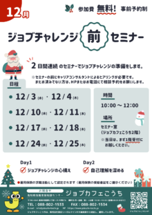 2日間連続のセミナーでジョブチャレンジの準備をします。15歳~概ね54歳の方(令和7年4月1日時点)が対象です。