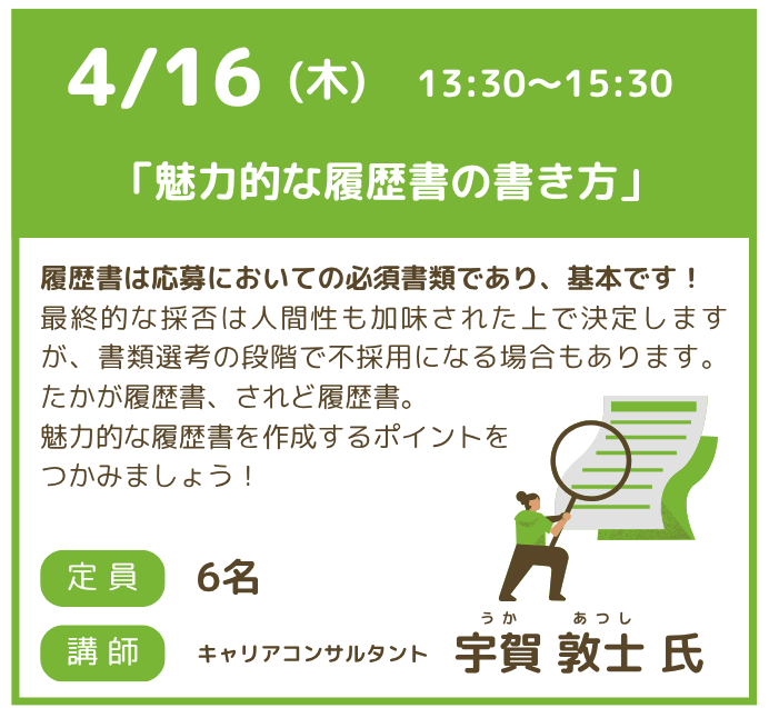 少人数セミナー 4/16 「魅力的な履歴書の書き方」